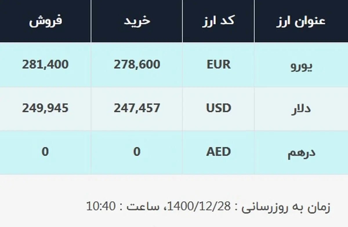 صرافیهای بانکها صبح امروز ۲۸ اسفند ۱۴۰۰ قیمت دلار را برای فروش به مردم ۲۴۹۹۴۵ ریال اعلام کردهاند که نسبت به آخرین قیمتهای روز کاری گذشته افزایش یافته است. نرخ خرید در این صرافیها نیز ۲۴۷۴۵۷ ریال است.