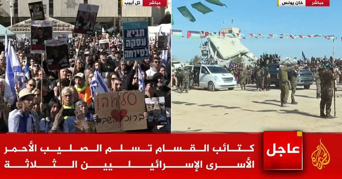 دو تصویر از غزه (محل آزادی 3 اسیر اسرائیلی ) و تل آویو (تجمع معترضان برای آزادی اسیران اسرائیلی)