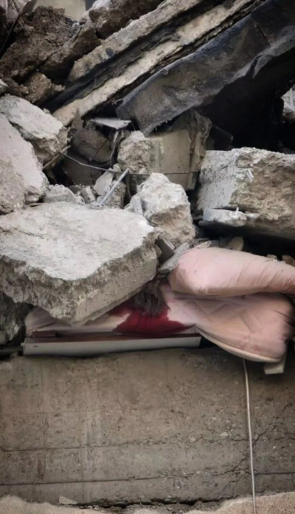 به گفته او، وسط ساختمان آنها مورد اصابت قرار گرفت و همین موضوع باعث شده ساختمان بریزد: «کسانی دیگر هم در ساختمان آنها فوت شده اند. آن عکس با تختخواب صورتی که خون رویشریخته برای همان محل است.»
